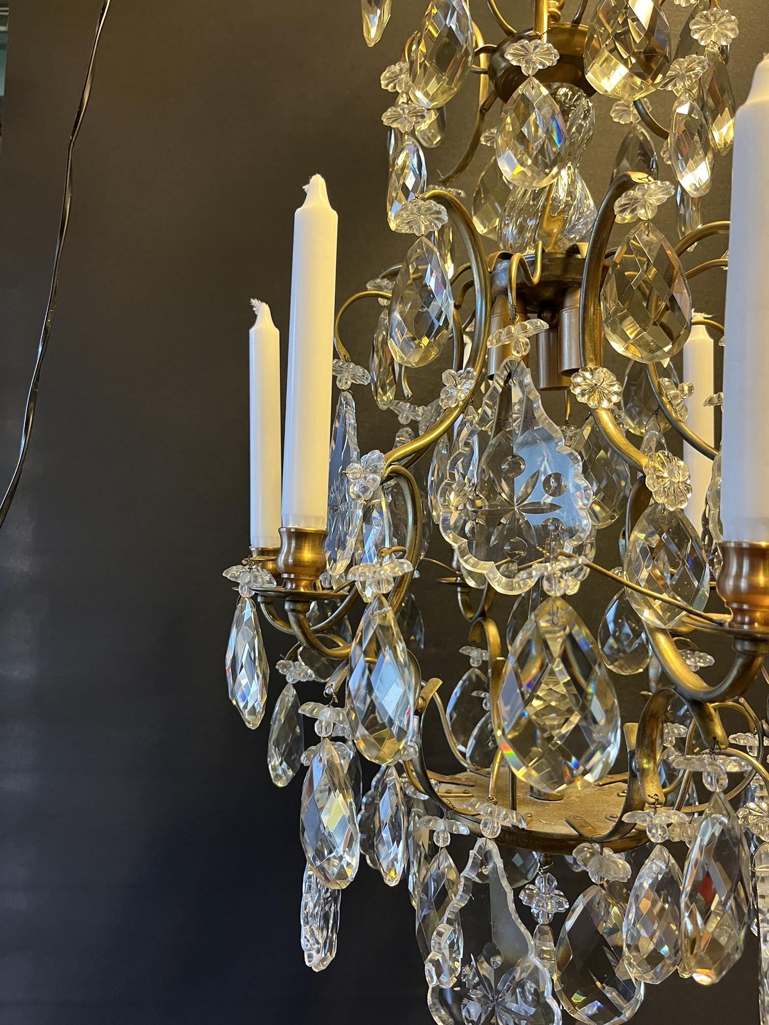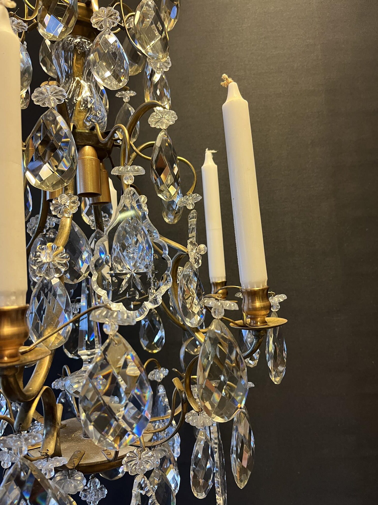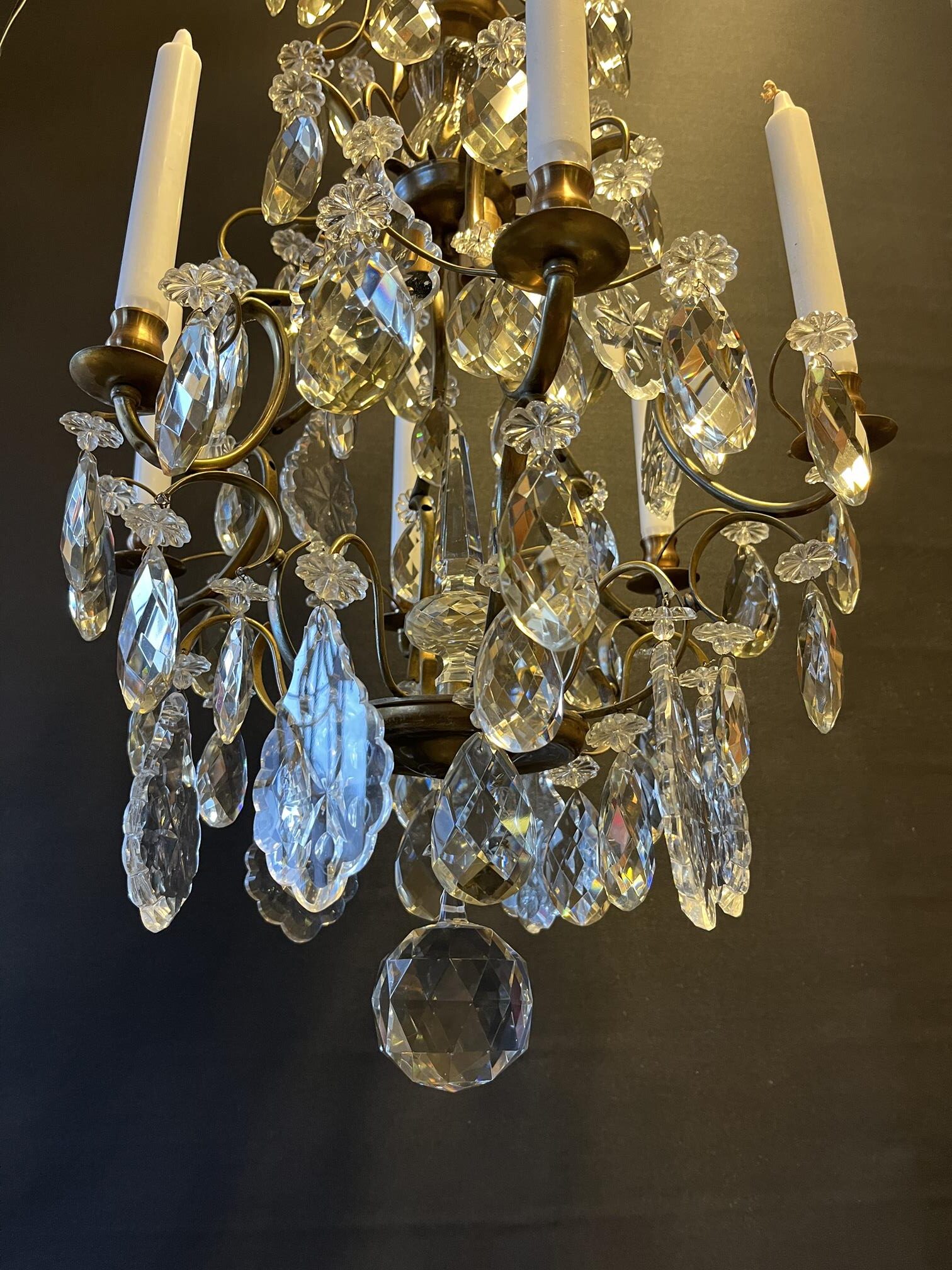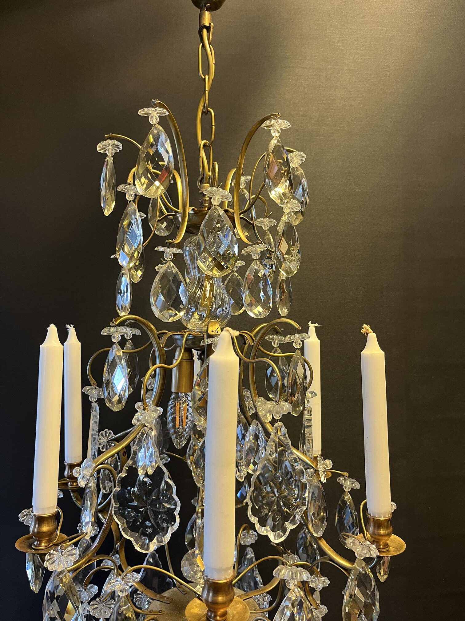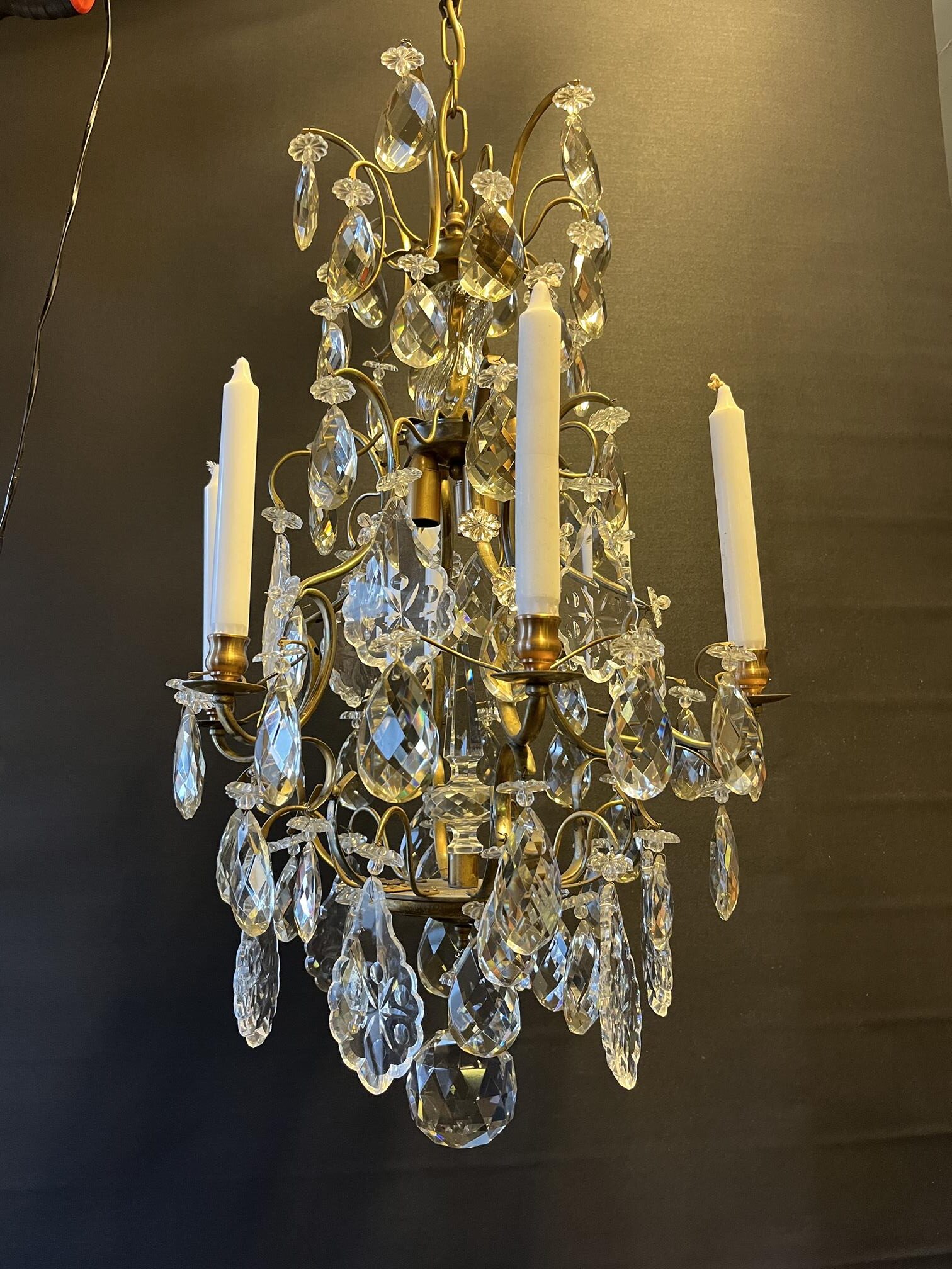Ljuskrona från 40 50 talet. Genomgången och ny el 6st armar för levande ljus Höjd: 75 cm Dia: 46 cm